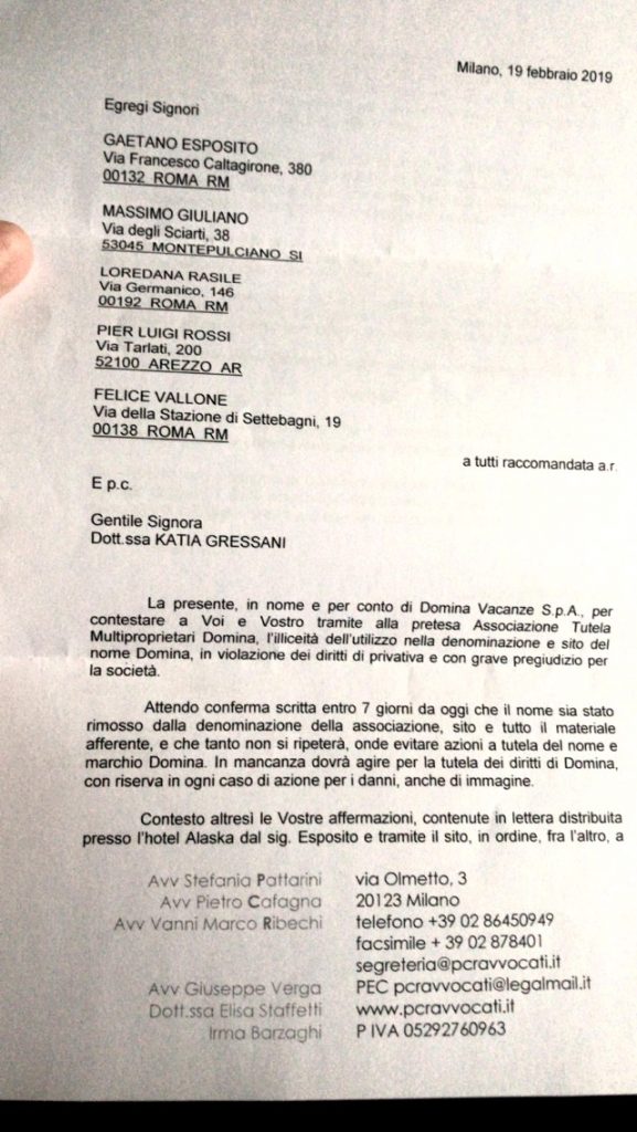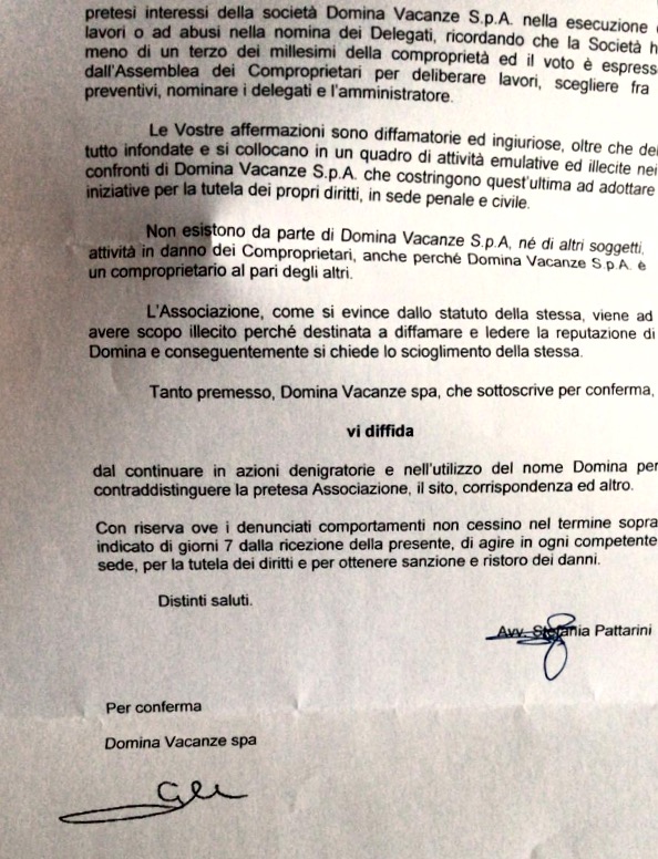 Dunque…… il ‘Saluto ‘ che Domina ha fatto alla nostra associazione è stato questa diffida , con la quale si è illusa di intimorirci ….così come continua a fare da anni…